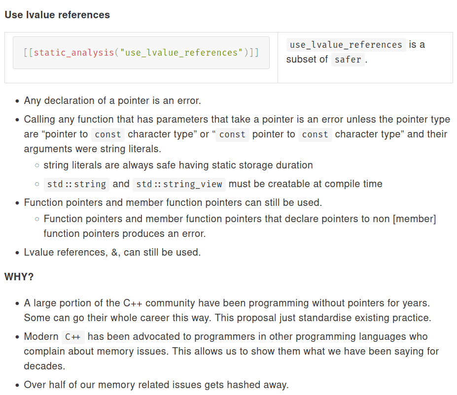 Estratto dall’articolo C++ is the next C++, che propone una nuova «modalità» di compilazione del C++ in cui disabilitare (quasi) del tutto i puntatori.